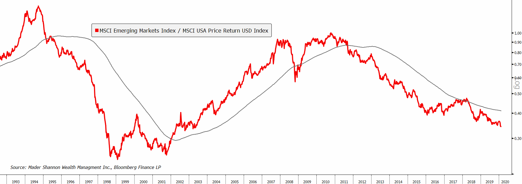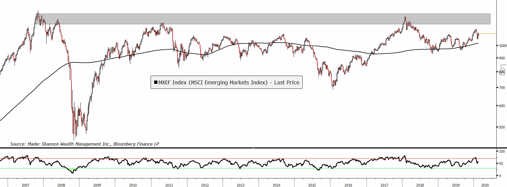Relative EM weakness is less a story about the United States than about EM itself. After a strong period of outperformance during the early 2000s, emerging markets have gone virtually nowhere for more than a decade. The cluster of highs set in 2007, 2011, and 2018 will be an area of significant resistance if this group tries to move higher.