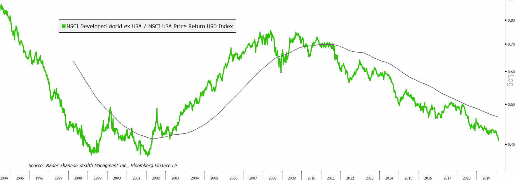 At first glance, developed markets look the same. Here they are underperforming U.S. stocks and reaching their lowest relative level since the early 2000s.