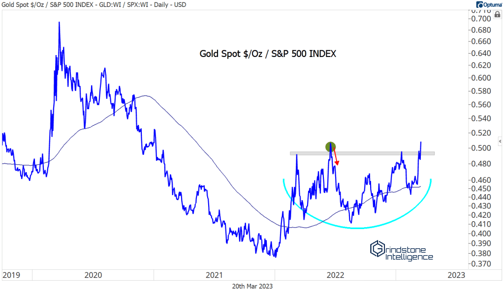 Gold is touching new multi-year highs when compared to stocks.