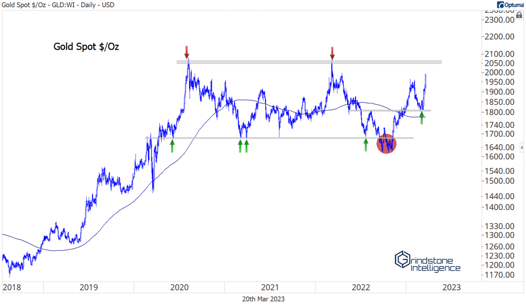 On an absolute basis, Gold is still stuck in a multi-year range between $1680 and $2060. But it’s approaching the top end rapidly.