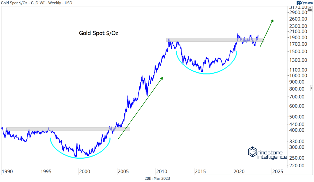 If it is, this rally in gold could just be getting started. Who’s to say we haven’t spent the last decade setting up for a repeat of the epic 2000s rally?